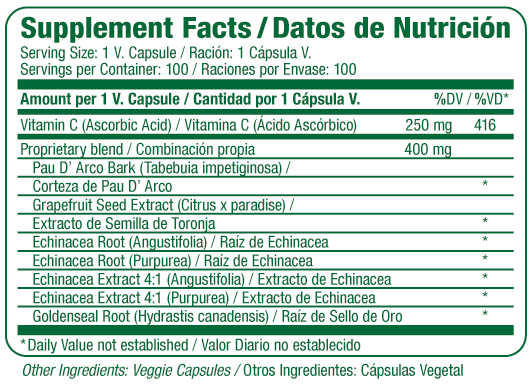 Ingredientes como el pau d’arco, las semillas de pomelo, la equinácea y el sello de oro aportan compuestos con propiedades antioxidantes e inmunoestimulantes que favorecen la actividad de los glóbulos blancos, refuerzan la respuesta frente a virus y patógenos y contribuyen a la salud general del sistema inmunitario.