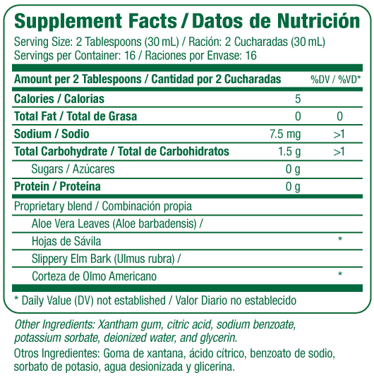 Aloe Vera Gel Complex Este producto es una mezcla única de hojas de aloe vera de alta calidad y extracto de corteza de olmo americano. Ambos ingredientes actúan de forma sinérgica y son eficaces para favorecer la salud digestiva.