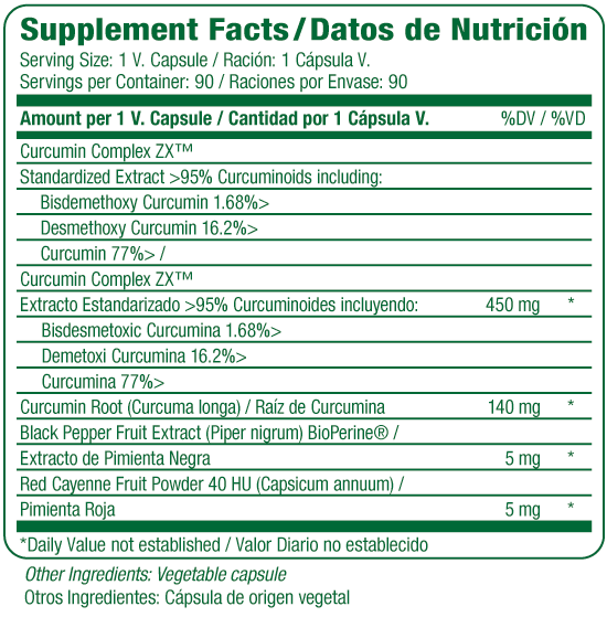 Curcurmin Extract Este producto es una combinación de extracto de curcumina ZX™, polvo de raíz de curcumina, BioPerine® y polvo de fruto de cayena roja.