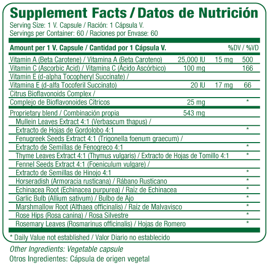 Las hierbas incluidas —como gordolobo, alholva, tomillo, hinojo, rábano picante, equinácea, ajo, malvavisco, escaramujo y romero— han sido usadas tradicionalmente para aliviar la tos, la congestión y la irritación de las vías respiratorias. Muchas de ellas tienen propiedades expectorantes, antiinflamatorias, antimicrobianas, antioxidantes e inmunoestimulantes.